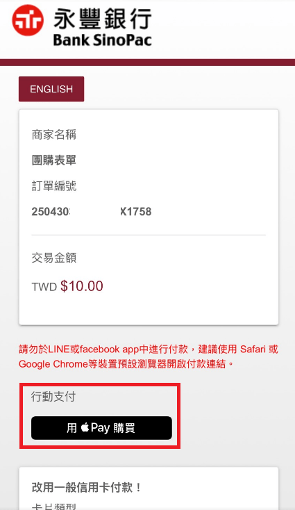 消費者可於永豐刷卡介面上看到行動支付"用Apple Pay"購買,若裝置不支援,也可直接使用輸入信用卡資料完成付款。