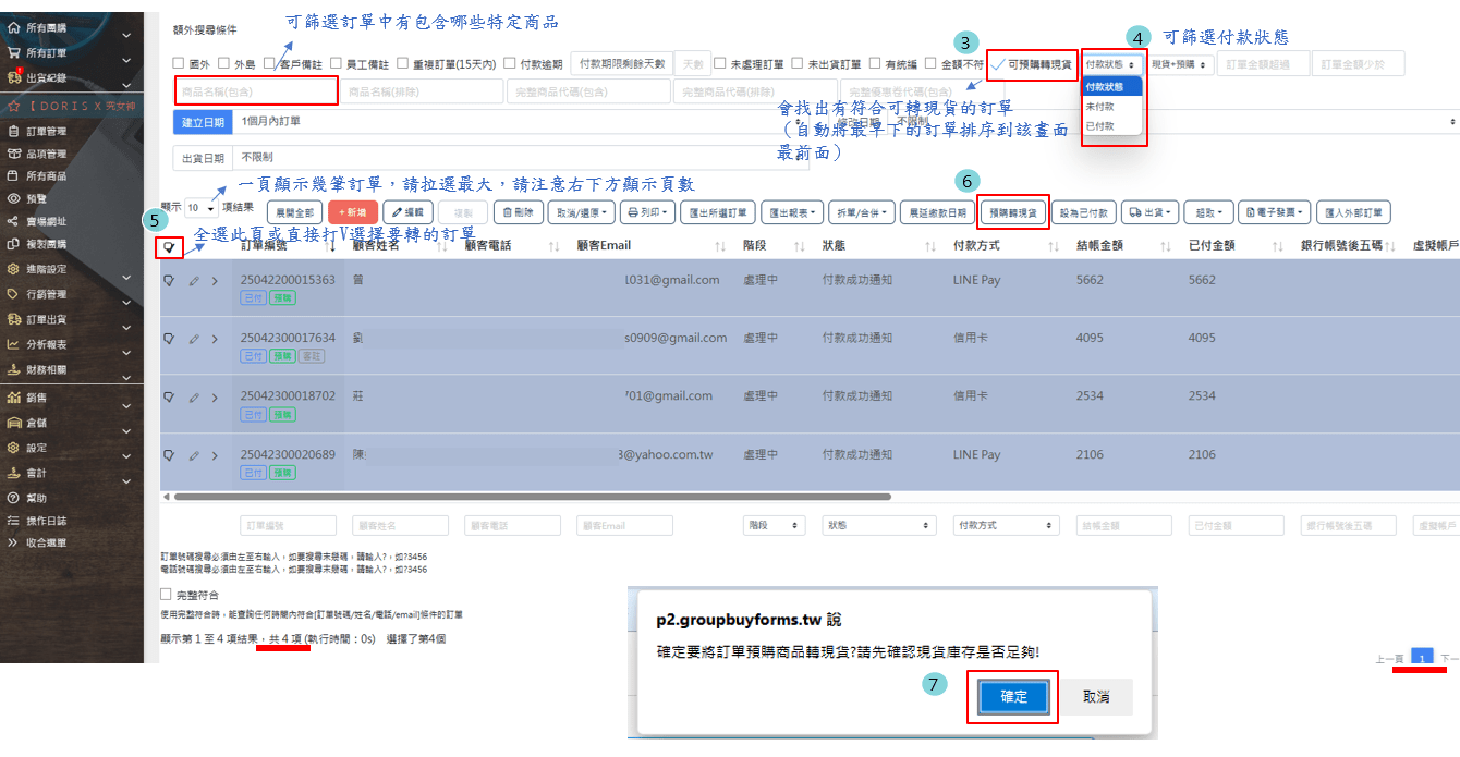 路徑:團 > [>] > 訂單 > 打V[預購轉現貨]> 拉顯示100項結果 > 全選打V