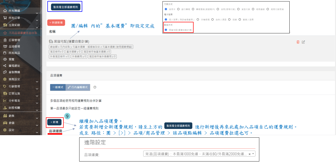 1.團購> [>] > 運費設定 > 新增基本運費:不論用件數或金額都是收0元運費 (主要用於前台的"配送方式"顯示這團配送方式為黑貓宅配)