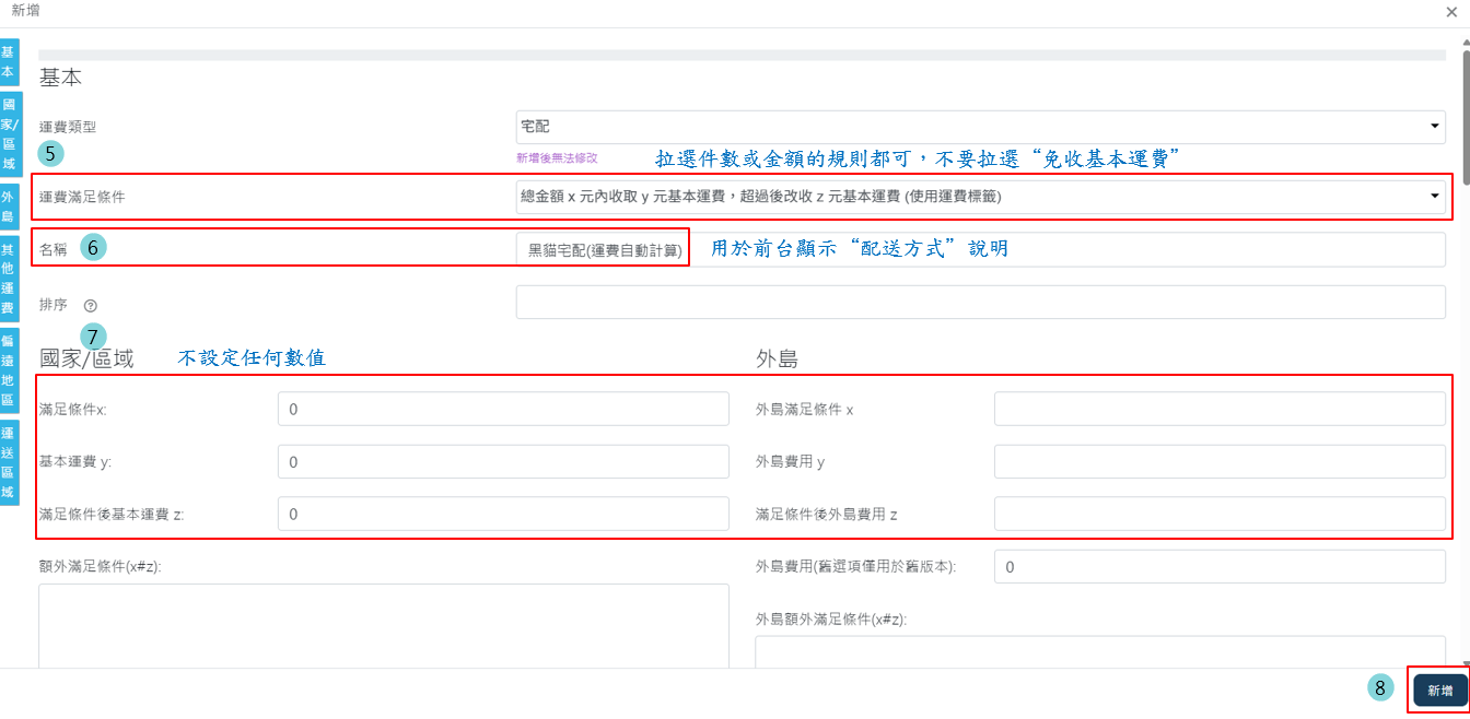 > 用於前台下單頁讓消費者選配送方式,故無需設定任何數值收取運費,只單純新增規則用於前台顯示“配送方式”的說明。