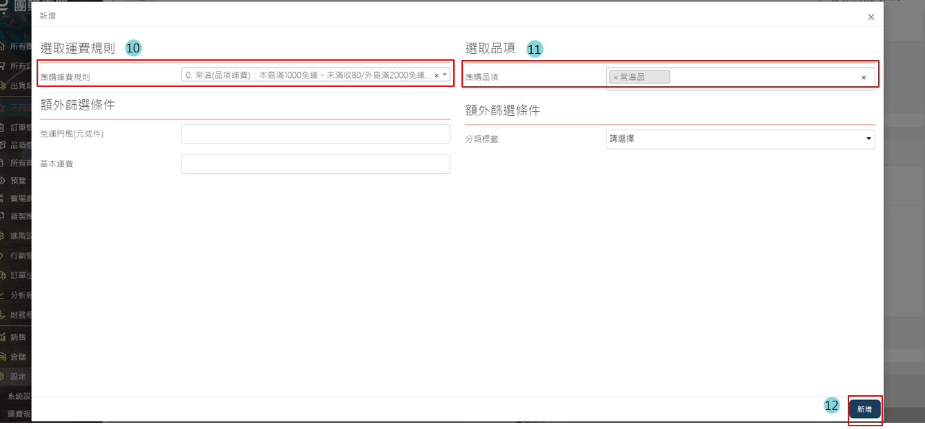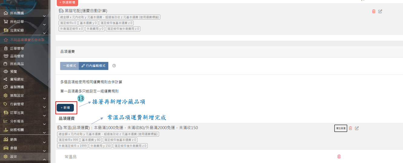 2.團購> [>] > 品項/商品管理 > 常溫品項 > 新增品項運費