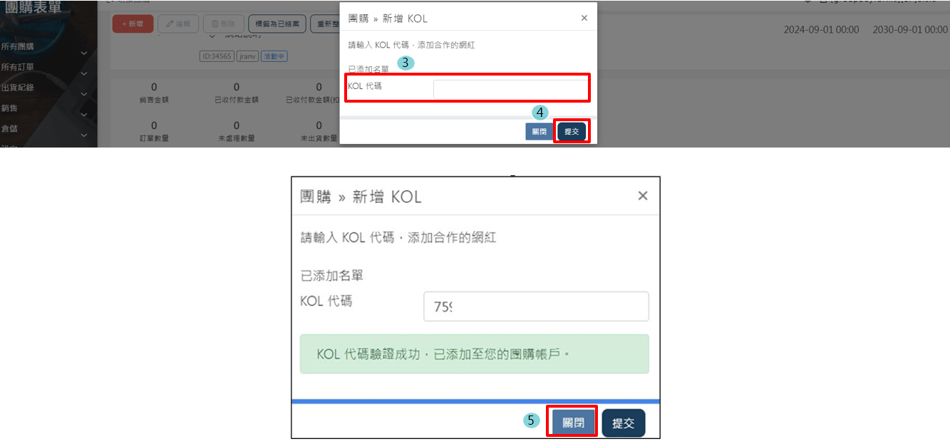 五.商家至該團 > [>] > 設定KOL代碼,輸入此團主的專屬代碼,該團業績及開團網址即可整合至團主可觀看的[團購表單銷售儀表板]內。