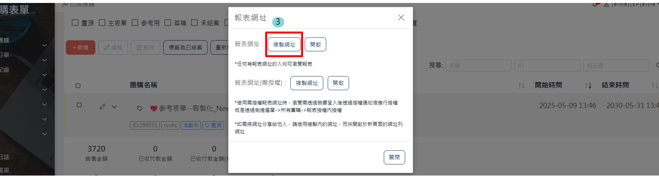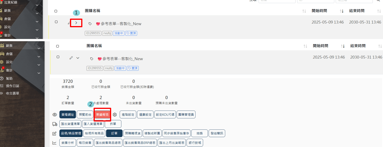 開團主可透過此功能,將他開的所有團(不限開哪間商家)整合所有團的業績報表/開團網址到這個畫面,也可直接從畫面導至該團業績報表查詢銷售狀況/營業額。
