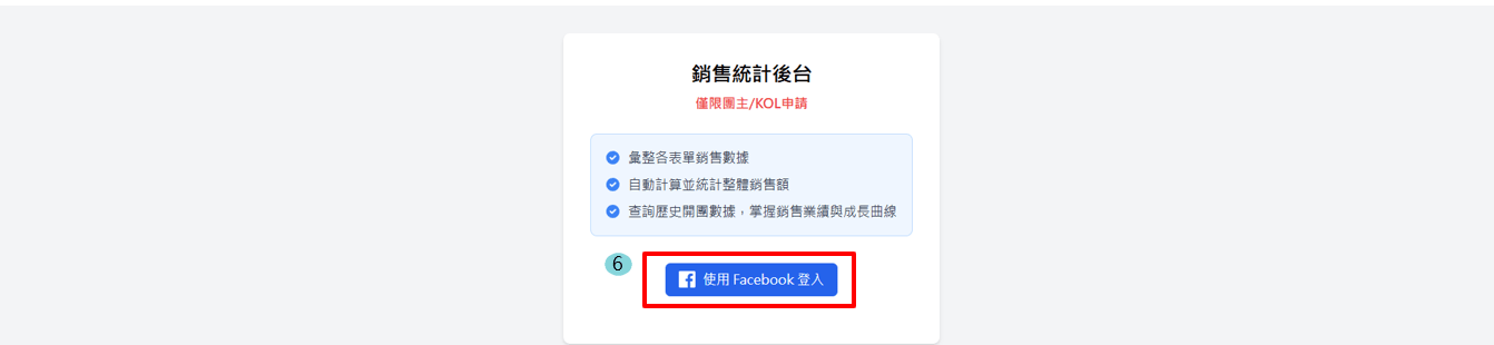 一.請團主先至任何一團他所開的業績報表畫面中登入臉書後申請,透過臉書授權給團購表單系統整合此功能。 (也可直接提供此路徑 https://kol.gbf.tw/ 給團主,請他用FB登入進行授權)