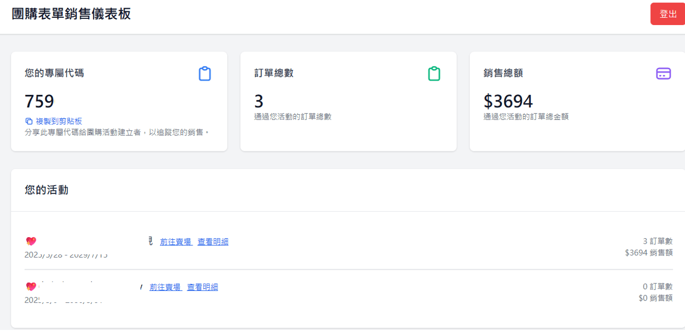 請團主再次進入畫面,就會看到銷售儀表板內整合的團。