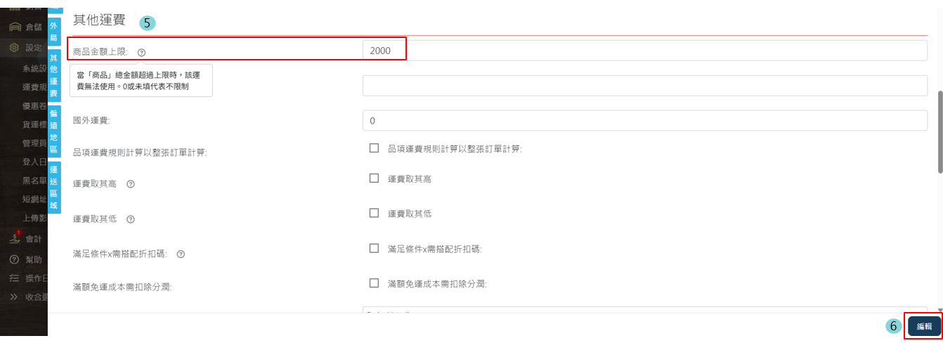商品金額上限 > 輸入上限數值  > 編輯 存檔