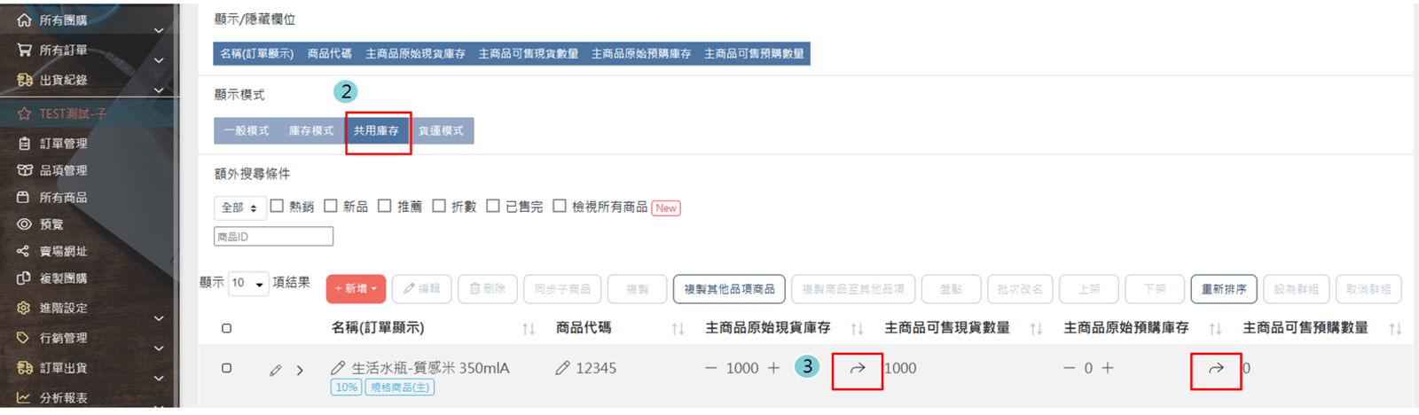 路徑:商品明細 > 顯示模式 > 點選[共用庫存]> 點 返回箭頭 ,即可回到主庫存團的商品位置。