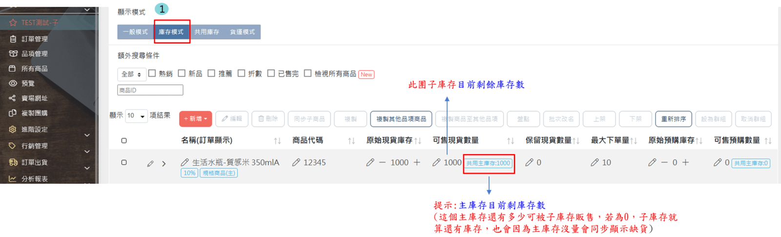 路徑:商品明細 > 搜尋欲查詢商品 > 庫存模式,可看子庫存/主庫存,各還有多少庫存量。