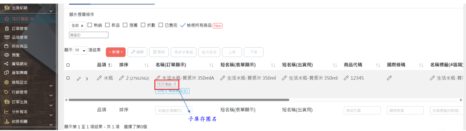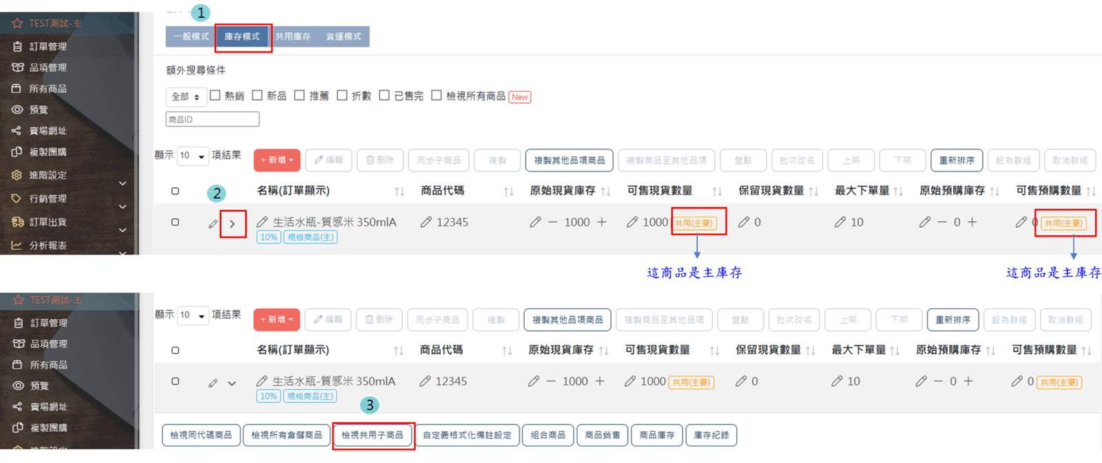 路徑:商品明細 > 庫存模式 > 欲查詢商品點 [>] > 檢視共用子商品,即可出現所有有共用到庫存的子商品。