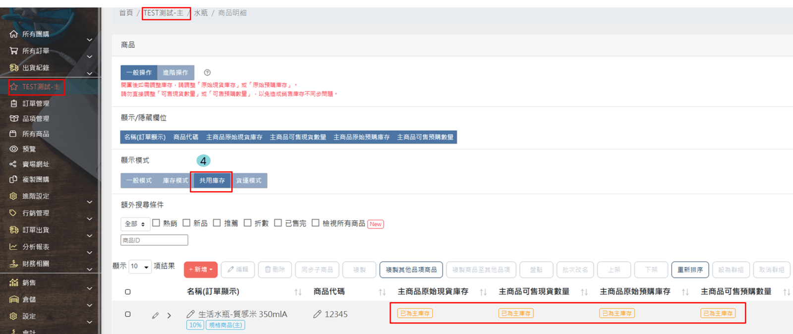 會看到回到主庫存團畫面 > 點[共用庫存],可看到黃色標籤已是主庫存。
