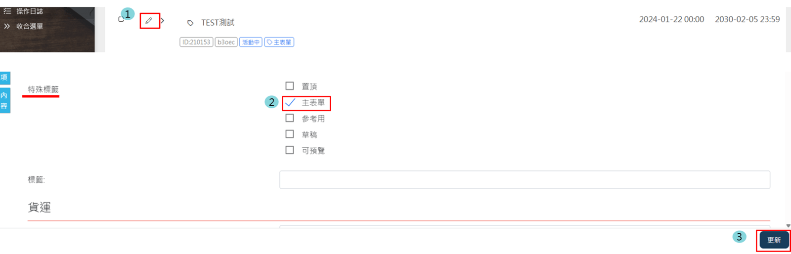 路徑:主庫存團 >  編輯   > 找到特殊標籤 > 打V [主表單] > 更新