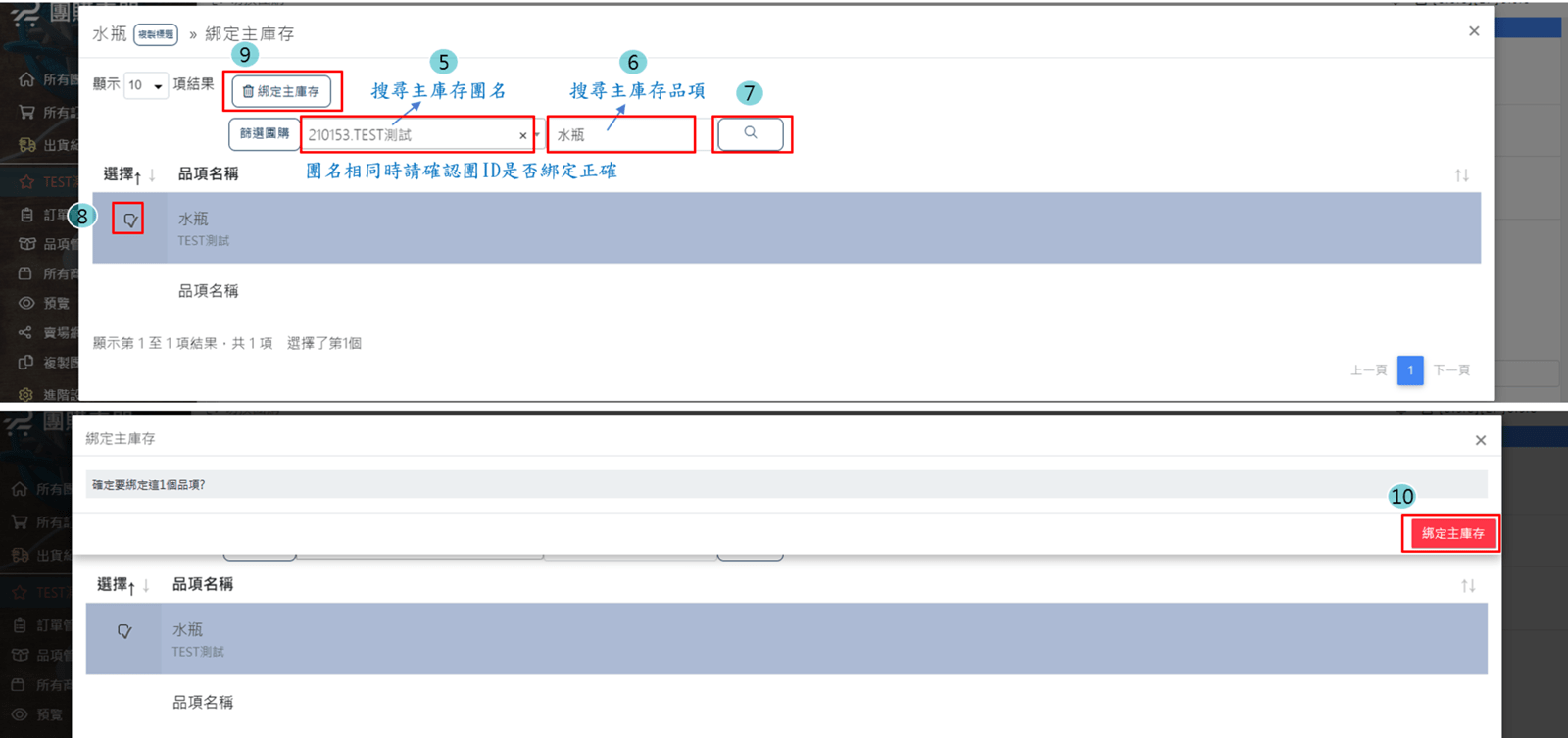 輸入主庫存團團名 > 也可再多輸入主庫存團的品項名稱 > 點放大鏡 > 打V綁定的品項 > 點 綁定主庫存