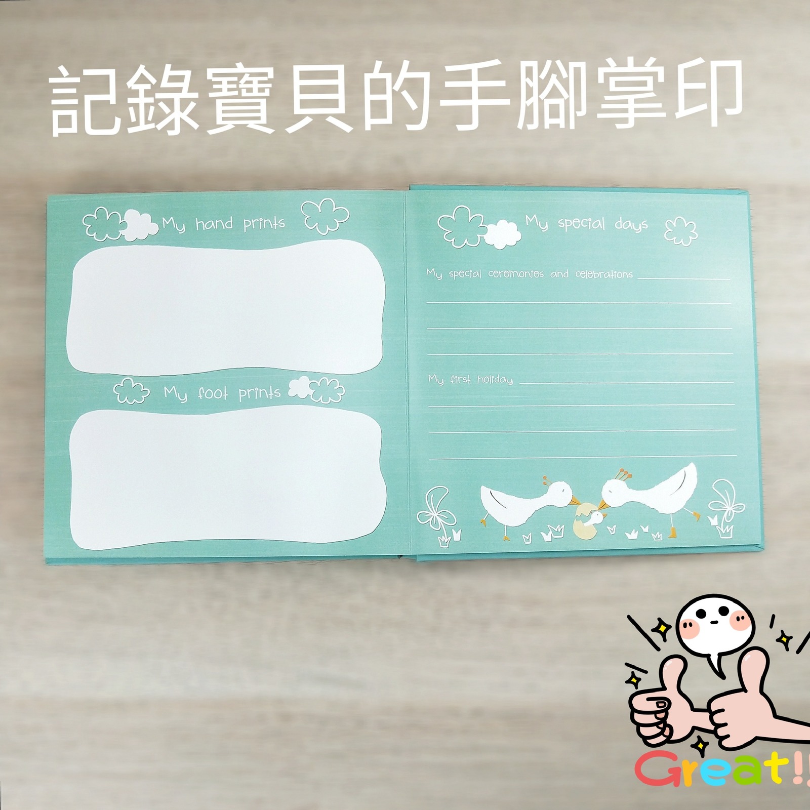 記錄寶寶成長點滴、出生資料、手腳印、週歲照片...等共22頁