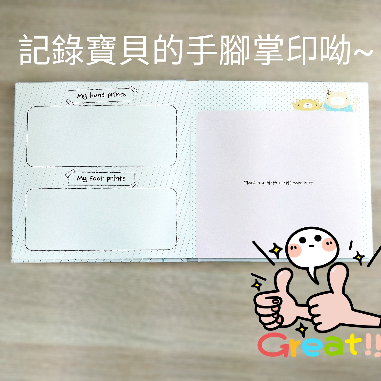 記錄寶寶成長點滴、出生資料、手腳印、週歲照片...等共22頁