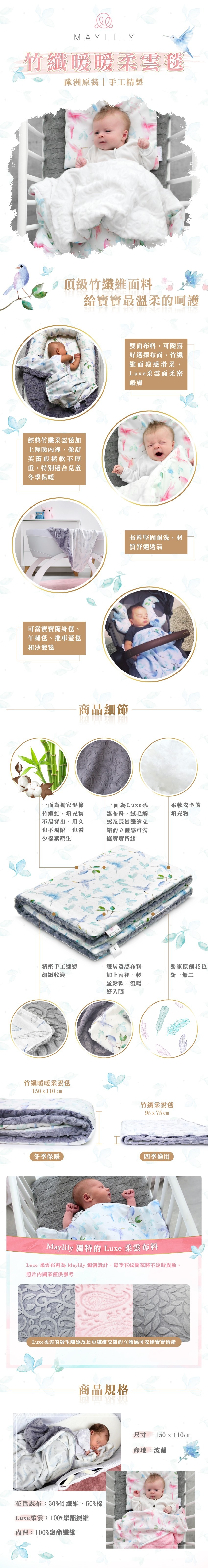 ● 雙面布料,可隨喜好選擇布面,竹纖維面涼感滑柔, Luxe柔雲面柔密暖膚● 經典竹纖柔雲毯加上輕暖內裡,像舒芙蕾般鬆軟不厚重,特別適合兒童冬季保暖● 布料堅固耐洗,材質舒適透氣● 可當寶寶隨身毯,午睡毯,推車蓋毯和沙發毯
